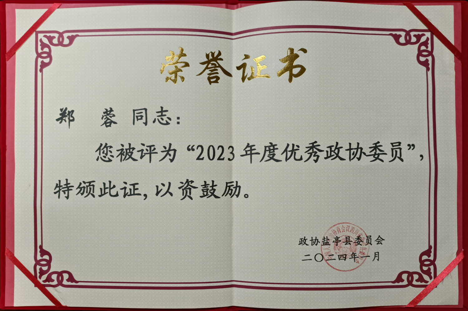 【喜訊】金和集團鄭蓉總經(jīng)理榮獲鹽亭縣2023年度優(yōu)秀政協(xié)委員表彰 - 1月31日上午,中國人民政治協(xié)商會議鹽亭縣第十一屆委員會第四次會議圓滿完成各項議程,在新區(qū)電影院閉幕。會議審議通過了政協(xié)鹽亭縣第十一屆委員會第四次會議決議、政協(xié)鹽亭縣第十一屆委員會第四次會議會期提案審查情況報告,表彰了優(yōu)秀委員、優(yōu)秀提案、優(yōu)秀社情民意信息。鹽亭縣政協(xié)委員、金和集團總經(jīng)理鄭蓉參加此次會議,并獲得了“鹽亭縣2023年度優(yōu)秀政協(xié)委員”的榮譽稱號。