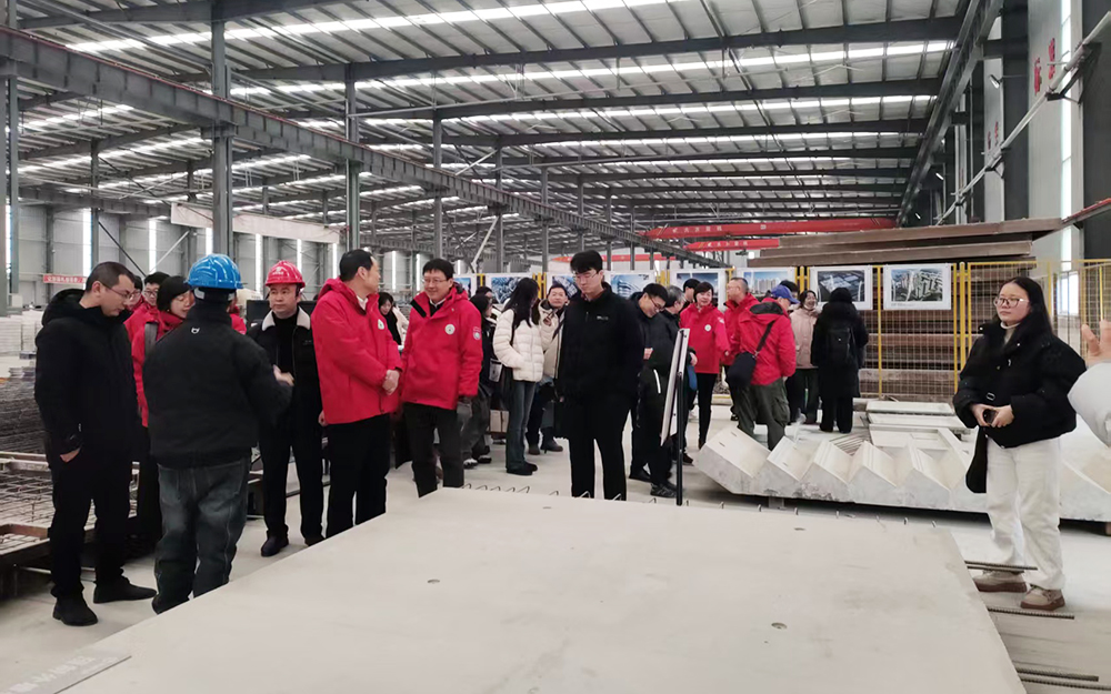 董發(fā)勤教帶領(lǐng)參觀團(tuán)近90人,先后前往公司各廠房參觀。在一期1號(hào)廠房,董教授一行實(shí)地察看裝配式建筑預(yù)制構(gòu)件的生產(chǎn)情況,現(xiàn)場(chǎng)了解我司現(xiàn)有生產(chǎn)工藝與產(chǎn)品品質(zhì)。在新建的3號(hào)廠房,詳細(xì)了解鋼結(jié)構(gòu)技術(shù)及產(chǎn)品在廠房的實(shí)際應(yīng)用和效果,以及該廠房后續(xù)在裝配式建筑和智能建造方向推進(jìn)產(chǎn)業(yè)化布局的規(guī)劃。